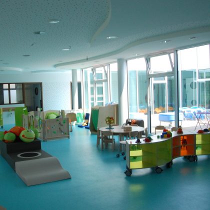 Les enfants évoluent dans un espace ouvert et neuf (construit en 2016), il a été réfléchi comme un espace aménagé pour tous afin de ne pas empêcher les interactions entre petits et grands mais en protégeant chaque enfant en fonction de son âge et de ses capacités.
